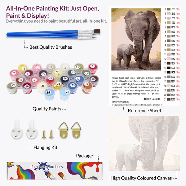 Unlock the creativity within you and let it explore the artistic world. This Elephant Mother's Love paint by numbers will be admired for years. Frame this stunning piece of art, hang it on your favorite wall and let it be the décor of your home. Feel the satisfaction of your favorite painting coming to life.